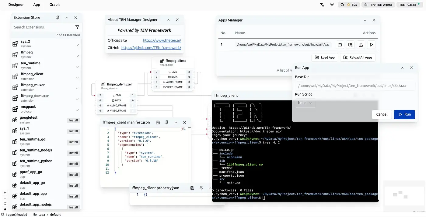 Since command-line tools are not as user-friendly as graphical user interfaces, TEN Manager includes a web UI-based visual development interface called TMAN Designer, in addition to the command-line interface. It provides rich functionality to help developers develop and debug TEN Apps and TEN Extensions. This means that developers only need to obtain the TEN Manager tool to access a complete TEN Framework development environment with both command-line and graphical user interfaces.