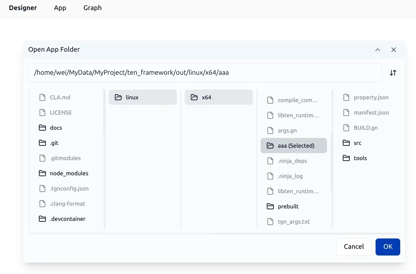 Through this file browser dialog, developers can specify the root directory of an existing TEN App to load it.