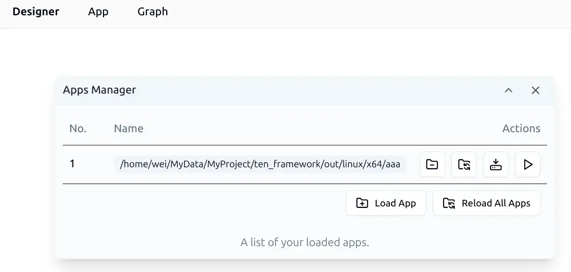 You can manage loaded TEN Apps using the Manage Loaded App(s) button in the App menu. After clicking the button, you will see the following Apps Manager interface: